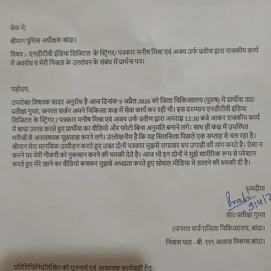 उपरोक्त विषयक सादर अनुरोध है आज दिनांक 9 अप्रैल 2026 को जिला चिकित्सालय (पुरुष) मे प्रार्थीया डाक्टर प्रतीक्षा गुप्ता, जनरल सर्जन अपने चिकित्सा कक्ष में सेवा कार्य कर रही थी। इस दरम्यान एनडीटीवी इंडिया डिजीटल के स्ट्रिंगर / पत्रकार मनीष मिश्रा एवं अजय उर्फ प्रवीण द्वारा अपराह्न 12:30 बजे आकर राजकीय कार्य में बाधा उत्पन्न करते हुए प्रार्थीया का वीडियो और फोटो बिना अनुमति बनाने लगे। साथ ही कक्ष में उपस्थित मरीजों से अनावश्यक पूछताछ करने लगे। उल्लेखनीय है कि यह सिलसिला पिछले एक सप्ताह से चल रहा है। श्रीमान मेरा मानसिक उत्पीड़न करते हुए उक्त दोनों पत्रकार मुझसे लगातार धन उगाही की मांग करते है। ऐसा न करने पर मेरी नौकरी को नुकसान करने की धमकी देते है। आज भी इन दोनों ने मुझे शारीरिक रूप से परेशान करते हुए मेरे खाने का वीडियो बनाकर मुझसे अभद्रता करते हुए सोशल मीडिया मे डालने की धमकी दी है।"
