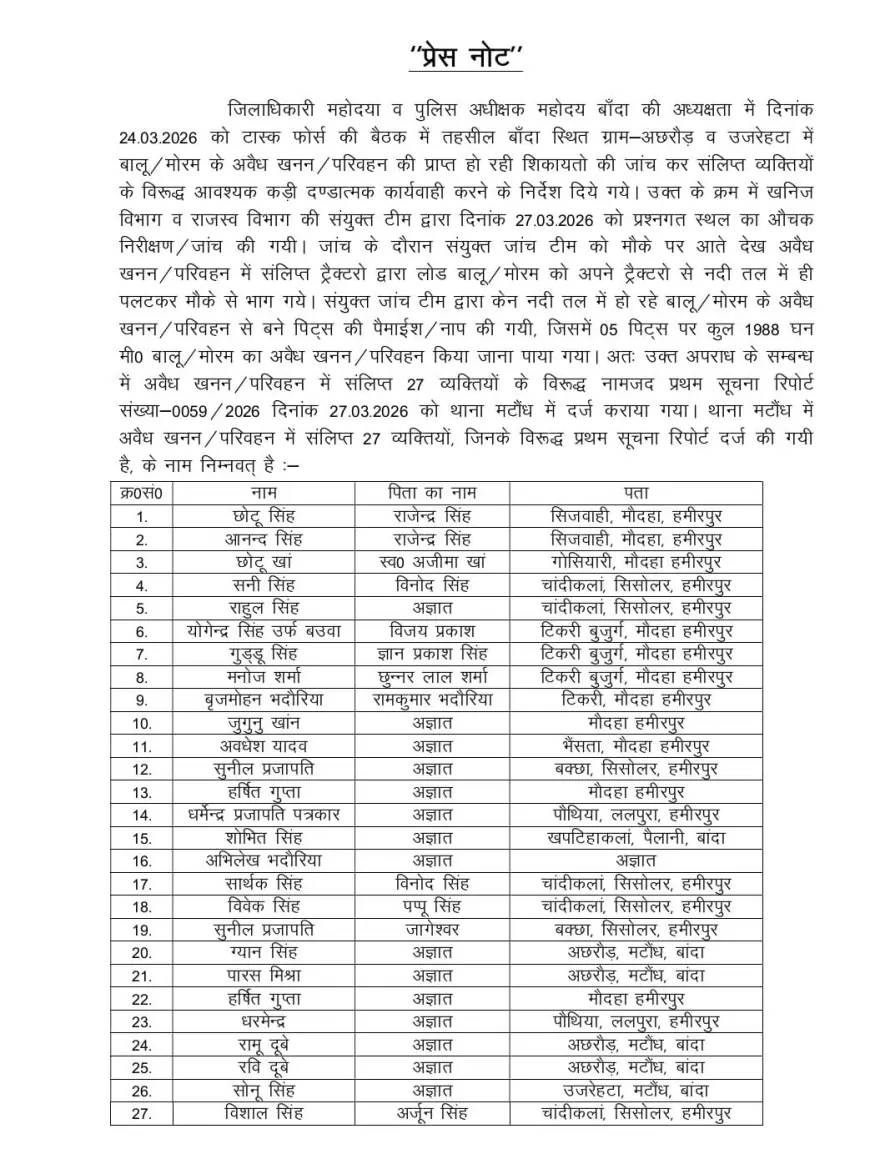 बांदा। जिले के थाना मटौंध अंतर्गत ग्राम अक्षरौड, उजरेहटा क्षेत्र में अवैध खनन कर रहे 27 लोगों पर मुकदमा दर्ज कराया है। यहां अवैध खनन की शिकायत मिलने पर जिलाधिकारी के निर्देश पर खान अधिकारी राज रंजन ने तफ्तीश की जिससे बांदा,हमीरपुर आसपास के 27 लोगों पर थाना मटौंध में एफआईआर लिखी गई है। राजस्व टीम एवं खनिज टास्क फोर्स की इस संयुक्त कार्यवाही में केन नदी पर 1988 घन मीटर अवैध खनन पाया गया है। उल्लेखनीय है अक्षरौड में बंद खदान के जिस मार्ग को जिला खनिज अधिकारी ने जेसीबी से काटकर बंद कराया था। उसे खोलकर इन 27 लोगों ने अवैध खनन किया है। जिसमें क्रमशः छोटू सिंह, आनंद सिंह, छोटू खां, सनी सिंह, राहुल सिंह, योगेंद्र सिंह बउआ, गुड्डू सिंह, मनोज शर्मा, ब्रजमोहन भदौरिया, जुगनू खान, अवधेश यादव, सुनील प्रजापति, हर्षित गुप्ता, धर्मेंद्र प्रजापति पत्रकार, शोभित सिंह, अभिलेख भदौरिया, सार्थक सिंह, विवेक सिंह, ज्ञान सिंह, पारस मिश्रा, धर्मेंद्र, रामू दुबे, रवि दुबे, सोनू सिंह, विशाल सिंह आदि शामिल है।