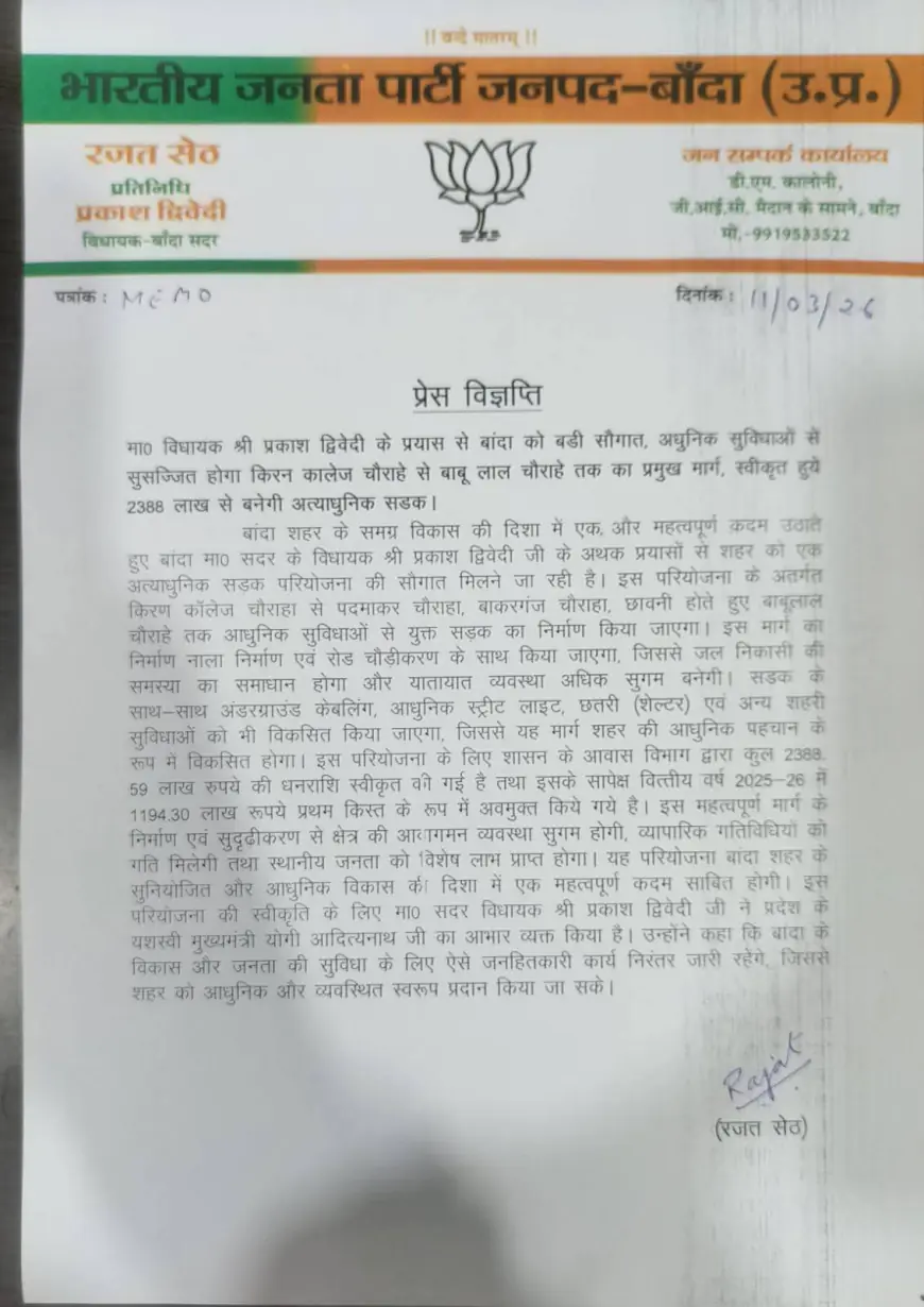 बांदा। शहर के समग्र विकास की दिशा में एक और महत्वपूर्ण कदम उठाते हुए बांदा सदर के विधायक प्रकाश द्विवेदी के अथक प्रयासों से शहर को एक अत्याधुनिक सड़क परियोजना की सौगात मिलने जा रही है। इस परियोजना के अंतर्गत किरण कॉलेज चैराहा से पदमाकर चौराहा, बाकरगंज चौराहे, छावनी होते हुए बाबूलाल चौराहे तक आधुनिक सुविधाओं से युक्त सड़क का निर्माण किया जाएगा। इस मार्ग का निर्माण नाला निर्माण एवं रोड चौड़ीकरण के साथ किया जाएगा, जिससे जल निकासी की समस्या का समाधान होगा और यातायात व्यवस्था अधिक सुगम बनेगी।